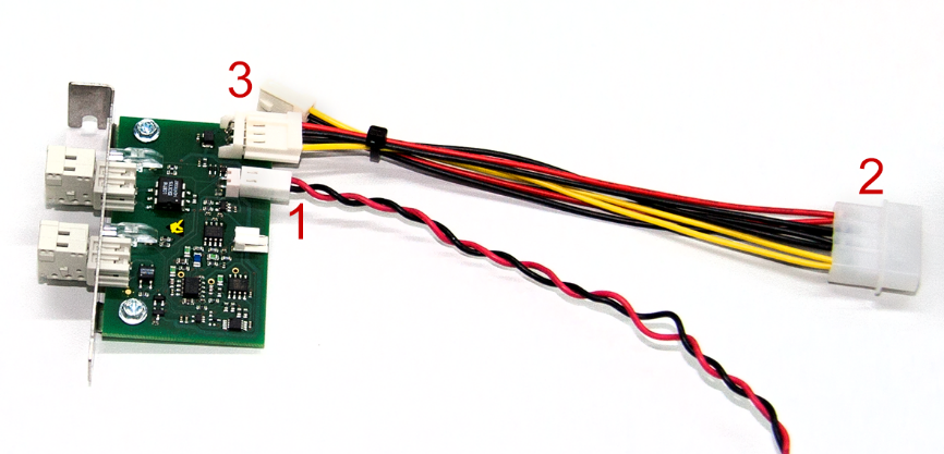 Power supply connection: Connect the connector of the power supply cable from the power supply unit (2 – picture above) with the wide connector of the cable included in delivery (2 – picture below). Make sure that the cables of the same color are connected. Plug one of the two narrow connectors to the 4-pin connector (3) of the card, the second narrow connector is not used.
