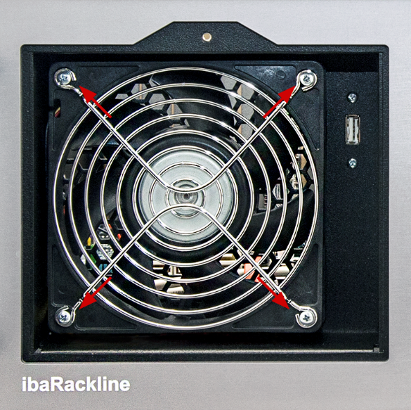 Je nach Einsatzort ist eine Reinigung oder ein Austausch des Lüfters notwendig. Entfernen Sie die Gitterklappe wie oben beschrieben und gehen wie folgt vor: