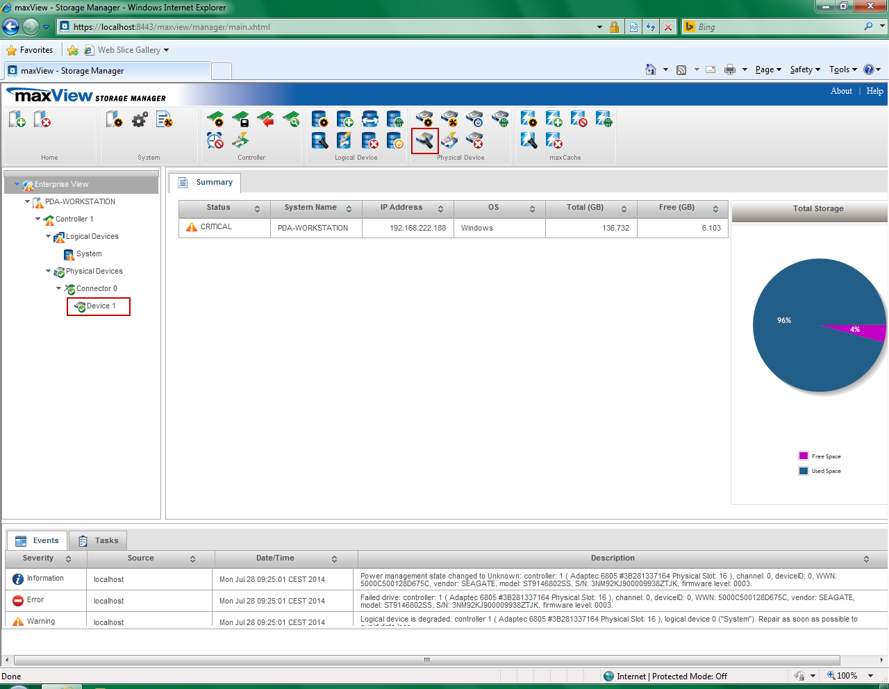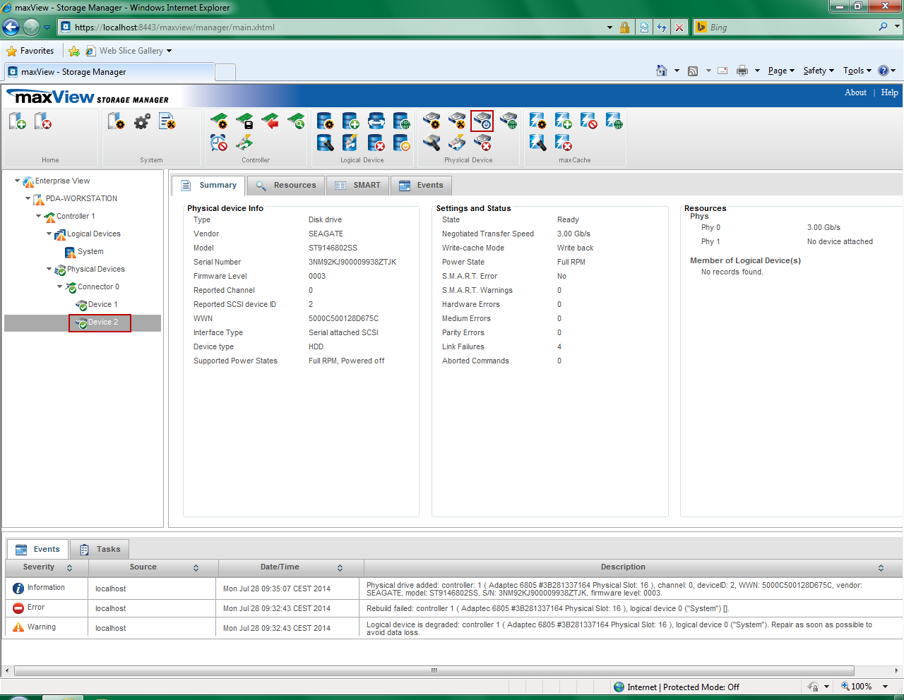 im Bereich „Physical Device“. Im Laufwerkskäfig blinkt die LED für die verfügbare