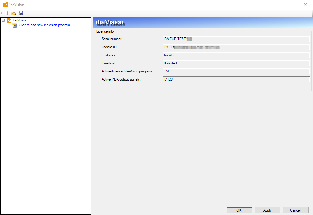 The main node ibaVision displays information regarding your license, like serial number of the license, license serial number, customer, time limit and active/licensed ibaVision programs.