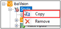 A copy of the ibaVision program and the module configurations can be created via the context menu, opened by right-clicking on the node in the configuration tree.
