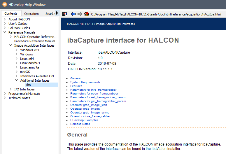 As soon as the “ibaHALCONCapture” interface has been installed, it is also possible to open the interface documentation in the HDevelop Help Window.