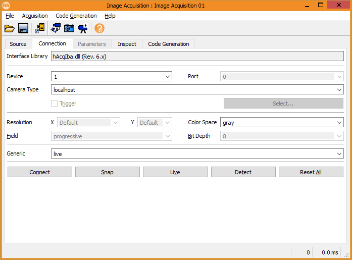 Once all parameters have been set, it is possible to test the interface by using the “Connect” and “Snap”/”Live” buttons.