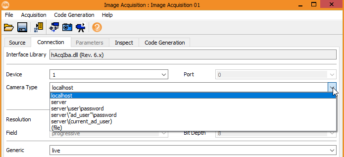 open_framegrabber('Iba', 0, 0, 0, 0, 0, 0, 'progressive', 8, 'rgb', ‘live’, 'false', 'server\\user\\password', '1', 0, 0, AcqHandle)