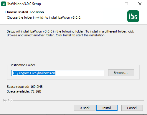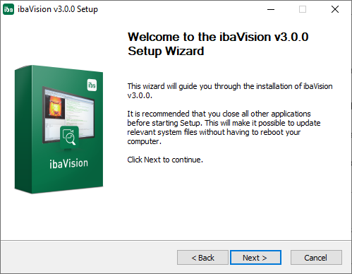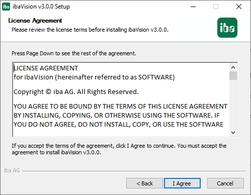 1. To install ibaVision, execute the file "ibaVision_setup_vx.y.z.exe" in the directory "\01_iba_Software\ibaVision" on the delivered data medium.