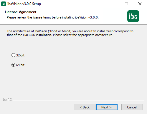 Depending on the installed HALCON version, ibaVision can be installed as 32-bit or 64-bit version. The 32-bit ibaVision version will be installed with a 32-bit HALCON library and the 64-bit ibaVision version will be installed with a 64-bit HALCON library. During installation you have to select whether to install the 32-bit or the 64-bit version of ibaVision.
