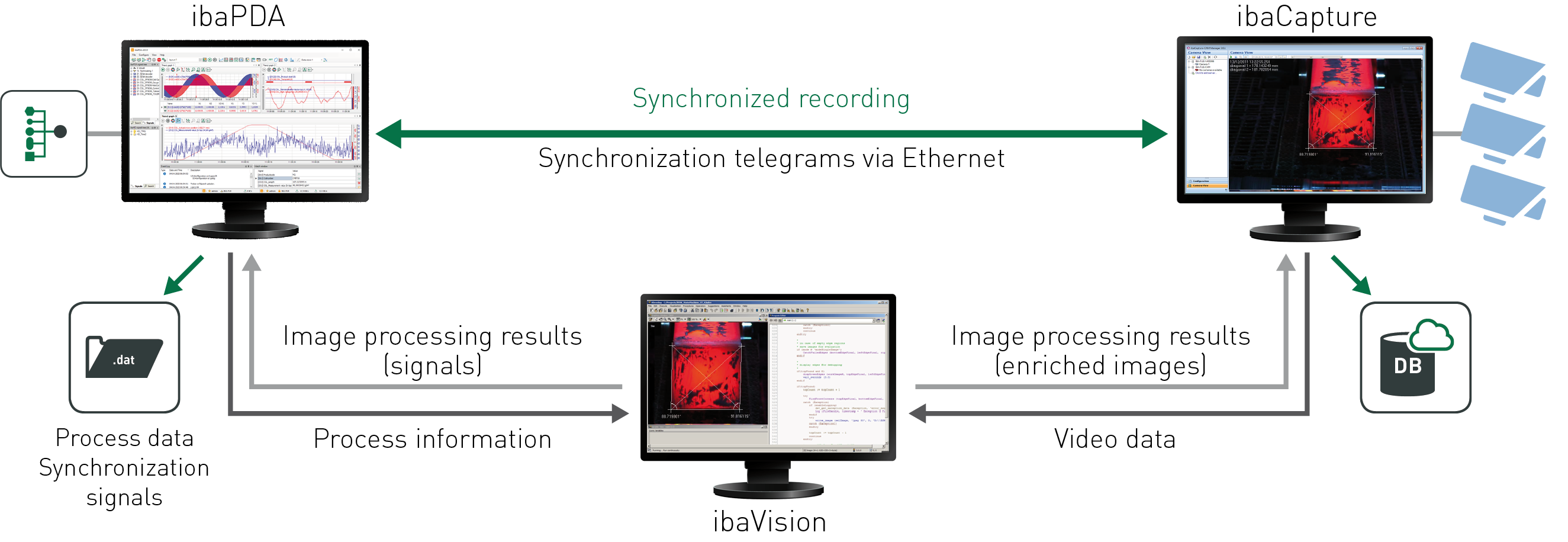 Cameras that are configured in ibaCapture can be used as image sources. Finally, resulting images from the image analysis which may contain markers or other additional visual information, can be encoded into a video stream. With ibaCapture such streams can again be recorded using a virtual camera.