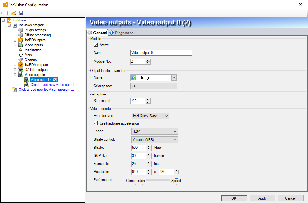 ibaVision supports Intel Quick Sync Video encoding and NVIDIA encoding. The desired encoder can be selected from a dropdown menu. The corresponding configuration options will appear accordingly.