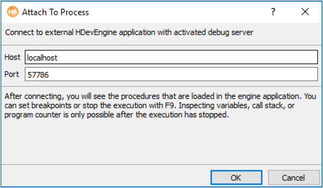 To attach to a running ibaVision program, open HDevelop and select ‘Attach To Process…’ in the Execute menu. A form will pop up where you enter the host on which ibaVision is running and the configured port. If a password has been set, this will be requested in a second step. After connecting to the ibaVision program, it is possible to step through your Halcon script and debug accordingly.