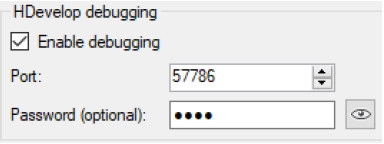 When the option Enable debugging is enabled, it is possible to debug HDevEngine applications remotely when using Halcon 13 or newer. Set a port and optionally set a password to restrict access to the debugging feature.