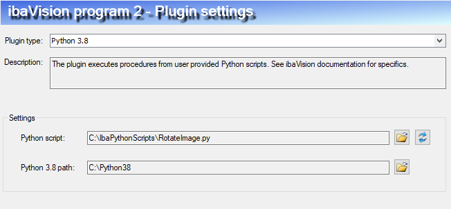 ibaVision does not provide its own Python interpreter or Python modules. To use the plugin, you need to have a working Python 3.8 setup installed on the system already. When creating a new program, ibaVision will attempt to determine the correct Python 3.8 home path from the Windows environment variable. If this process fails for some reason or there are multiple Python 3.8 installations on the system, the path can be changed here. Clicking the button will open a Windows dialog where you can select the correct Python 3.8 home directory. If this path is changed, a complete restart of ibaVision is required to reload all references.