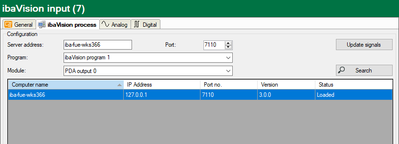 When the desired ibaPDA output module is selected, click the <Update signals> button. The signals configured in the ibaPDA output module in ibaVision will automatically be mapped to the corresponding signals in the ibaVision input module in ibaPDA.