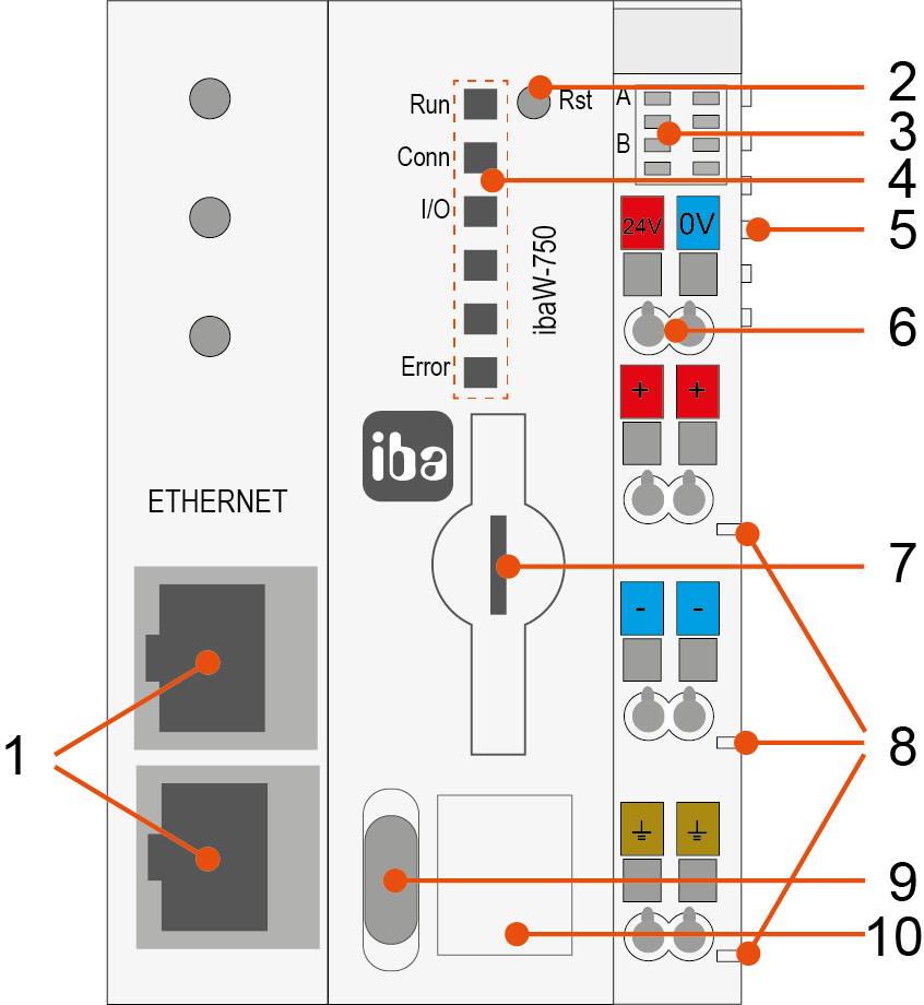Die folgende Ansicht zeigt die Bedien- und Anzeigeelemente, sowie die Anschlüsse des Geräts ibaW-750 .