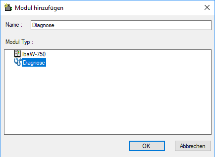 Um ein Diagnosemodul hinzuzufügen, wählen Sie im Dialog Modul hinzufügen den Typ "Diagnose" aus.