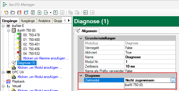 Ein Diagnosemodul wird erst nach Zuweisung zu einem ibaW-750-Modul aktiv und stellt dessen Verbindungsinformationen zur Verfügung. Durch die Nutzung eines Diagnosemoduls können Sie die Diagnoseinformationen auch im ibaPDA-System durchgängig aufzeichnen und auswerten.
