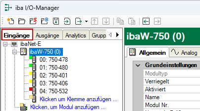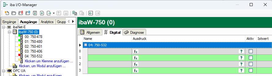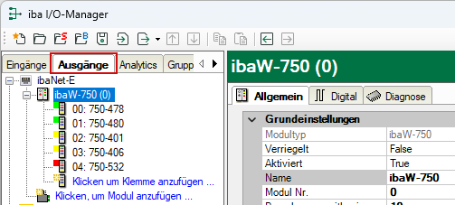 Gleichzeitig wird das ibaW-750-Gerätemodul im Register Ausgänge am entsprechenden Link angezeigt: