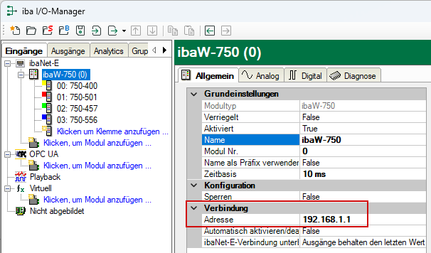 Geben Sie für eine erfolgreiche Konnektierung zunächst die (Netzwerk-)Adresse an, über die das ibaW-750-Gerät erreicht werden kann.