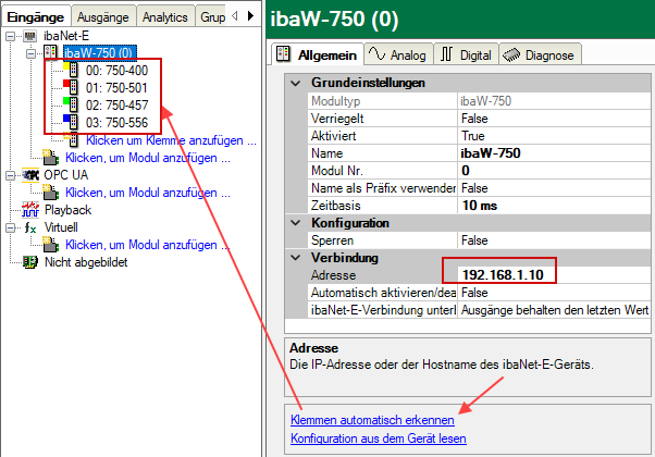 Um die angeschlossenen Klemmen anzufügen, klicken Sie im Register Allgemein auf den Link Klemmen automatisch erkennen.