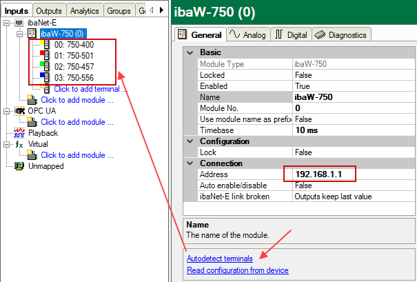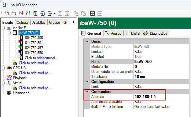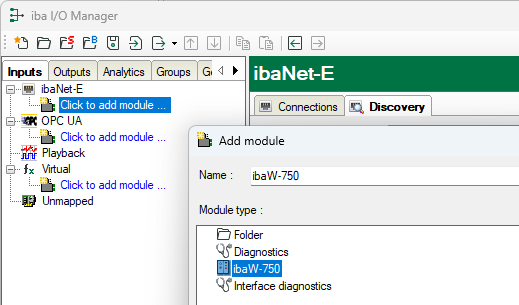 Prerequisite: The ibaW-750 device must have been configured separately in advance. The configuration can be carried out in the same LAN or from another ibaPDA system. For information on configuration, see chapter Device settings.