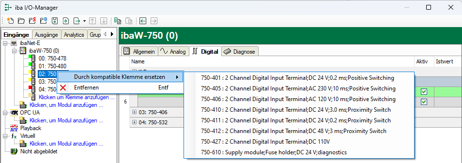 Bei digitalen Klemmen kann die genaue Klemmenbezeichnung nicht über den K-Bus ausgelesen werden. Der Klemmentyp wird jedoch richtig erkannt und in ibaPDA wird eine Klemme mit der entsprechenden Anzahl an Ein- und Ausgängen angezeigt. Die angezeigte Klemme kann nun mit einer anderen kompatiblen Klemme ersetzt werden: Klicken Sie hierzu mit der rechten Maustaste auf die Klemme und wählen die gewünschte Klemme aus.