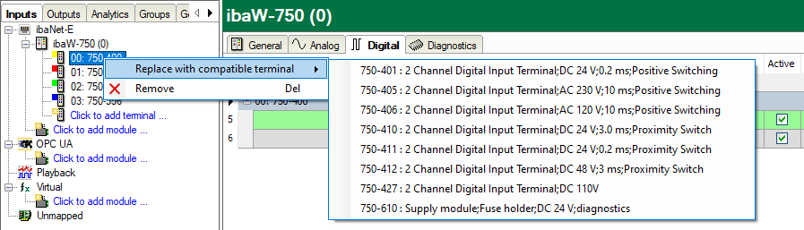 The terminal names of digital signals cannot be read out via the K-bus. However, the terminal type is correctly recognized and a terminal with the right numbers of inputs and outputs will be displayed in ibaPDA. This terminal can be replaced with another compatible terminal. Right-click on the terminal and select the desired terminal.