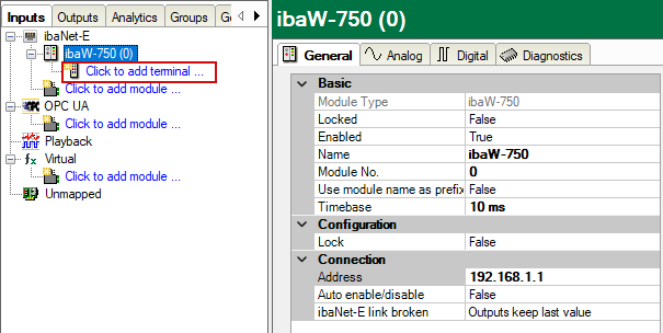 Select the "ibaW-750" module and click on the Click to add terminals... link.
