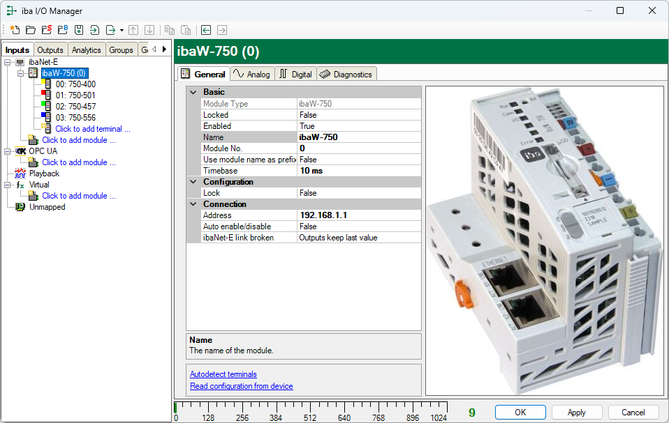 In the General tab, make the basic settings, configuration and connection settings for the "ibaW-750" device module.