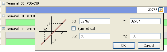 For making the calculation of Gain/Offset easier, an auxiliary dialog appears when clicking on the co-ordinate cross icon in the Gain or Offset field. In this dialog, you only enter two points in the line equation. Gain and Offset are then calculated automatically.