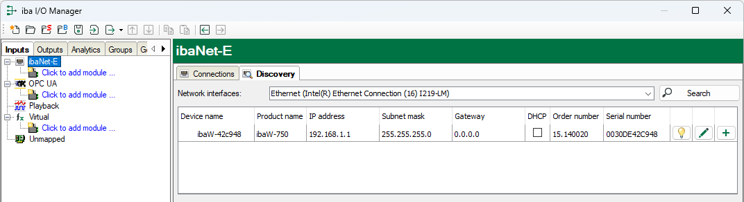 Please note that this search can only be successful if the device is located in the same LAN as the ibaPDA computer or has also been preconfigured for this LAN.