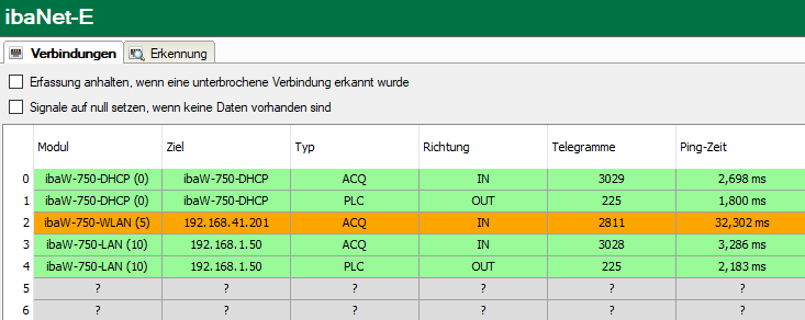 Während einer gültigen ibaNet-E-Empfangsverbindung wird zyklisch ein Ping zum ibaNet-E-Gerät ausgeführt. Die gemessene Zeitdauer wird hier angezeigt und ist ein Maß für die Verbindungsgüte des Ethernet-Netzwerks. Je kürzer diese Zeit ist, desto besser ist die Verbindungsgüte und sicherer die Datenübertragung. Ist die Verbindungsgüte schlecht, wird die entsprechende Verbindung orange hinterlegt.