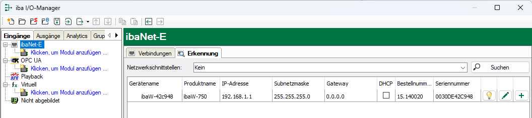 Markieren Sie die Schnittstelle "ibaNet-E" und wählen das Register Erkennung aus: