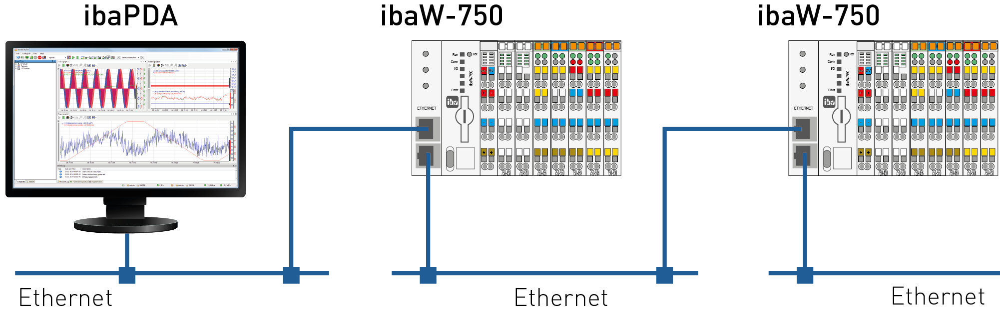 ibaW-750 wird über ein Ethernet-Netzwerk an den ibaPDA-Rechner angeschlossen. Hierbei ist es unerheblich, welche der beiden Ethernet-Schnittstellen verwendet wird. Das Gerät arbeitet mit dem ibaNet-E-Protokoll zur Übertragung von Konfigurations- und Messdaten.
