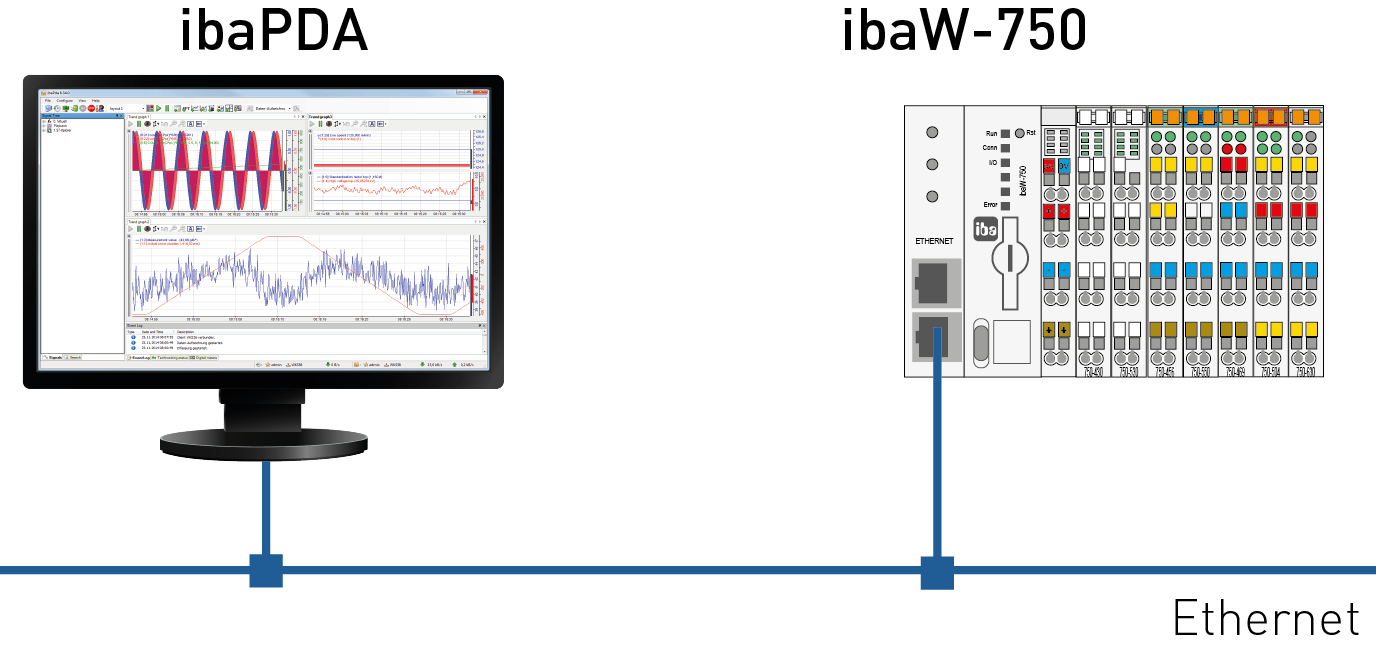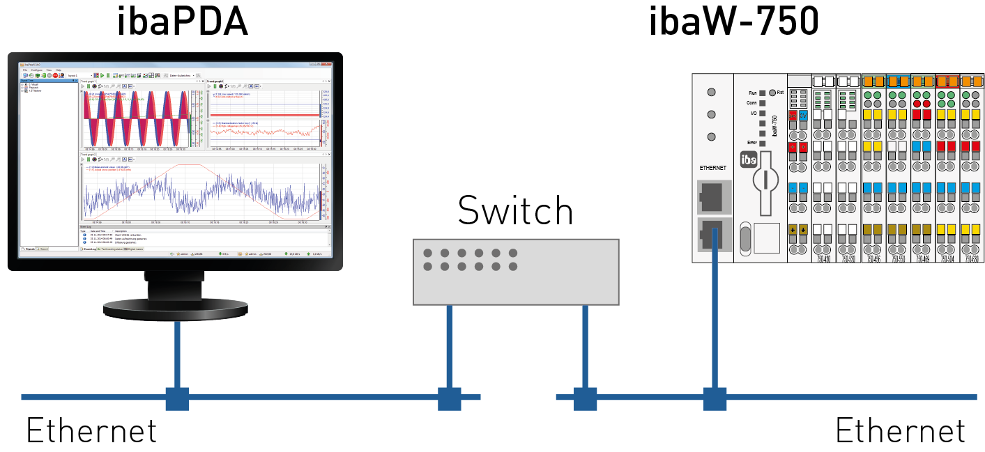 ibaW-750 is connected to the ibaPDA computer via an Ethernet network. It does not matter which of the two Ethernet interfaces is used. The device works with the ibaNet-E protocol for the transmission of configuration and measurement data.
