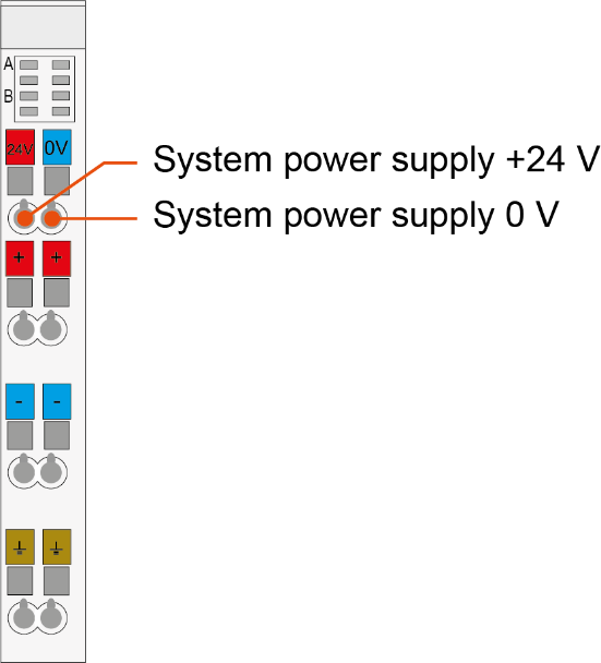 The 24 V voltage is internally converted to a 5 V operating voltage (galvanically connected). The voltage does not only supply the device, but is also available via the terminal bus for supplying the corresponding connected terminals.