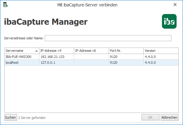 2. In der Serverliste werden alle Server aufgelistet, die im Netzwerk gefunden wurden. Mit einem Klick auf den Button <Suchen> wird das lokale Netzwerk nach weiteren ibaCapture-Servern durchsucht. Es können auch ibaCapture-Server gefunden werden, die unter einer vorhergehenden ibaCapture-Version liefen.