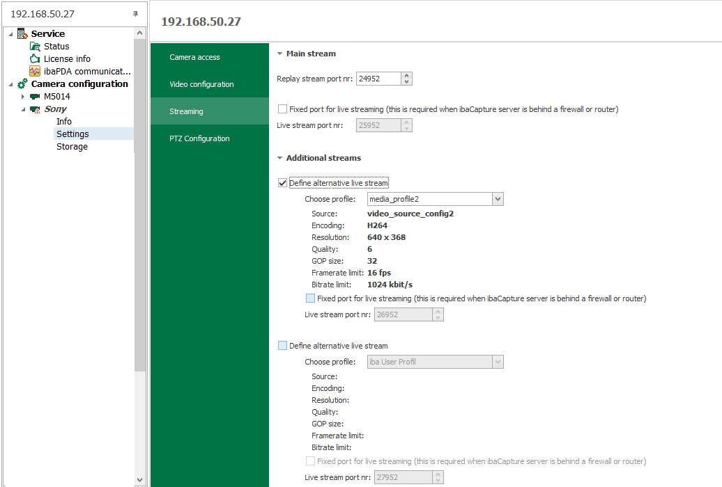 You can configure up to 2 alternative live streams for each camera. The following settings may serve as an orientation: