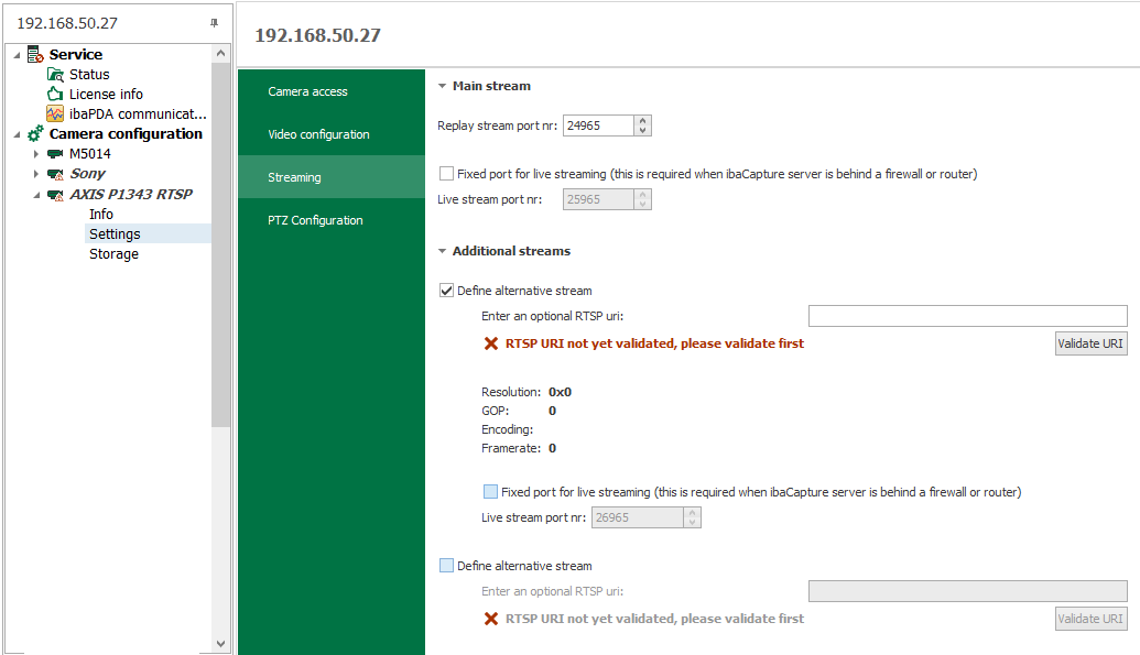 Set a checkmark in the area Additional streams for 1 or 2 alternative live streams. You have to enter an URI (Uniform Resource Identifier) for RTSP sources. In this URI, the video parameters are defined with an according resolution.