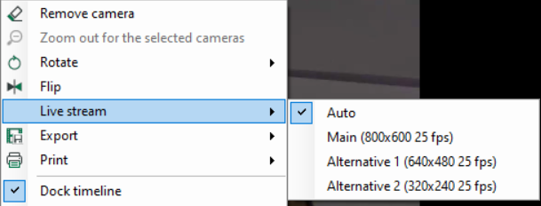 In the camera view, the user can define which live stream will be displayed. Open the context menu in the respective camera view with a right mouse click. (For a description, see chapter Submenu Live stream)