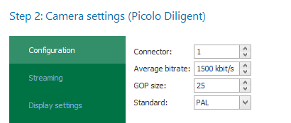 The following settings are required for analog cameras (Picolo Diligent):