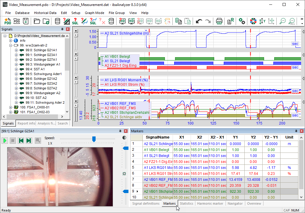 Once you have configured ibaAnalyzer with all the required measurement signals and video recordings, you can analyze the measurement data and view the measured values in relation to the video sequences.
