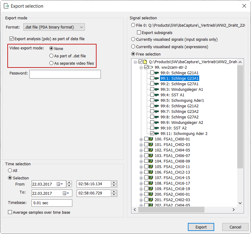 The "as part of data file" export function is conceived for a case in which data files including their synchronized video files are to be played irrespective of the video server. A network connection to the video server is thus not necessary. A new DAT file is created which contains the selected measuring signals and video recordings. Continuous and triggered video recordings can be exported in one data file.