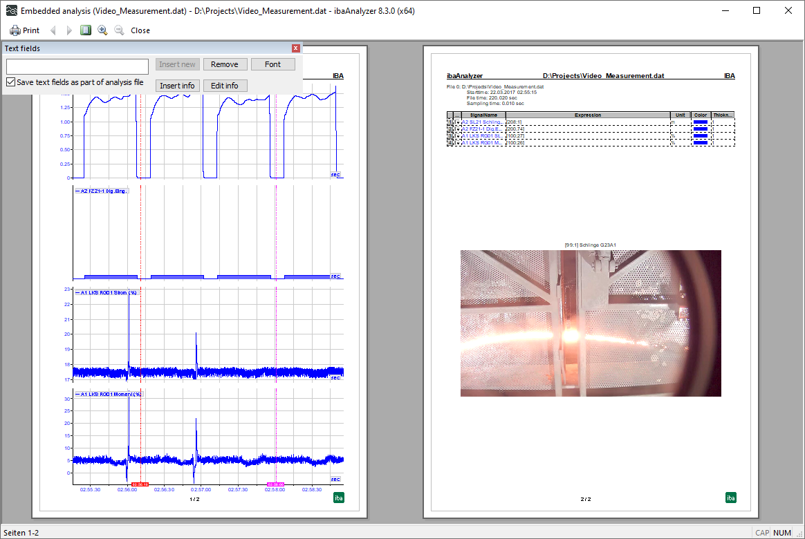 You can print out all currently displayed video images using standard print function of ibaAnalyzer. The still images from the cameras are printed out after the signal table, as can be seen in the print preview below.