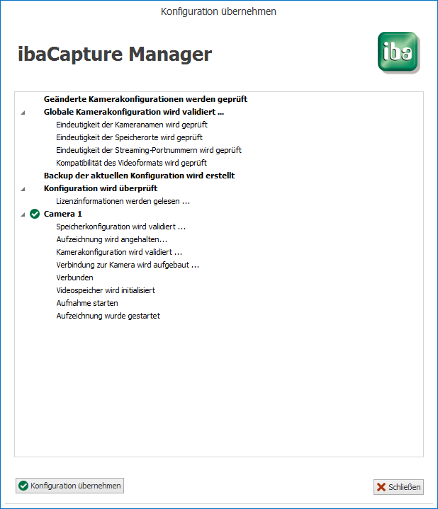 ibaCapture-Manager speichert die Konfigurationen in einer XML-Datei auf dem Videoserver. Danach wird der Video-Dienst erneut gestartet und die Änderungen treten in Kraft. Die Festplatte (die Partition für Videodateien) wird neu konfiguriert.