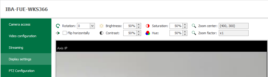 A number of display settings in the ibaCapture Player can be set and saved as default settings in the Display settings tab for each camera: rotation, flip horizontally, brightness, contrast, saturation, hue, zoom center, zoom factor.
