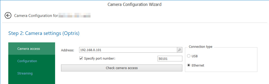 Ethernet: Enter the network address of the camera and the port number. Click the <Check camera access> button to verify that the connection to the camera is successful.