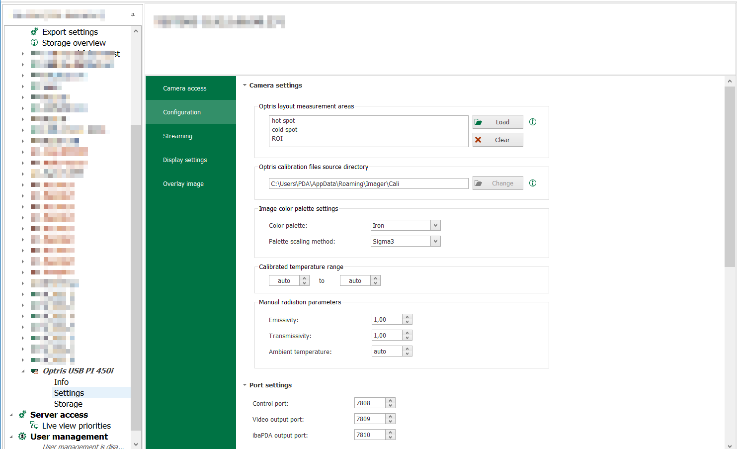 The Optris Frame Grabber runs as a separate process and uses three ports. The port numbers are set automatically, but can be changed: