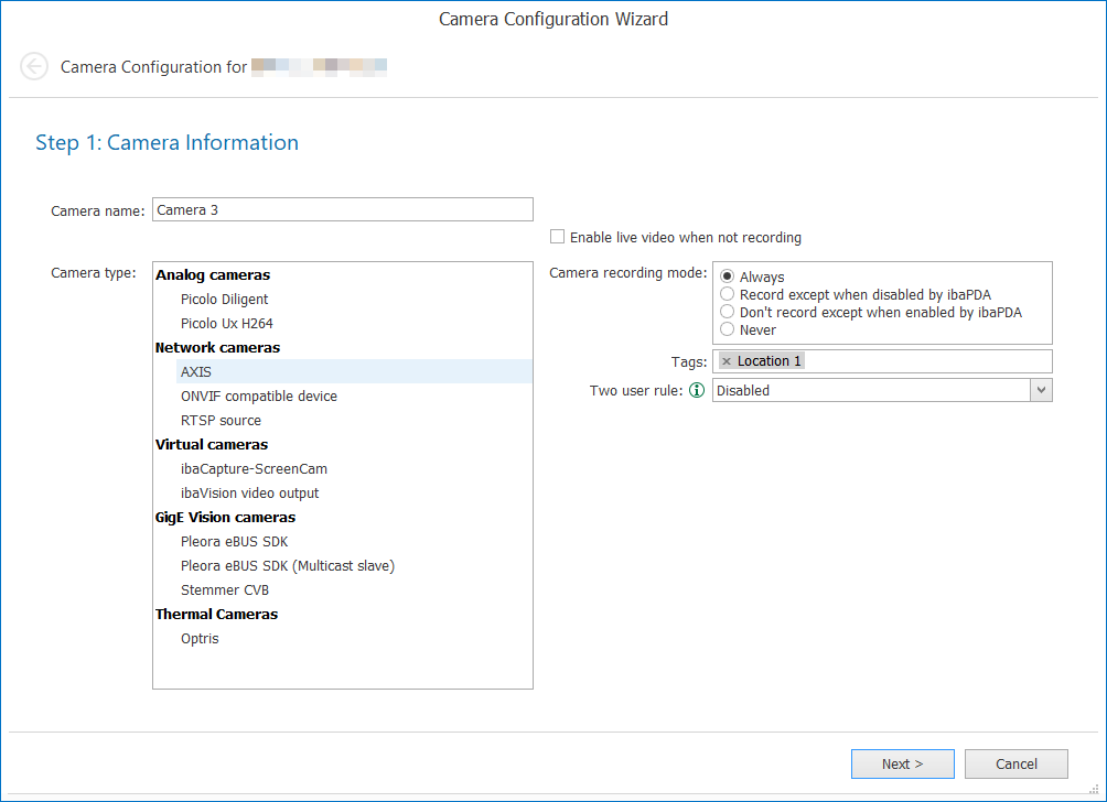 In the first step of the camera configuration, you select the camera type and can assign a name.