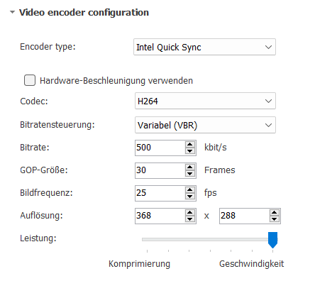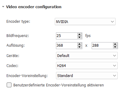 Wenn Sie den Video Encoder ausgewählt haben, werden die dazugehörigen Konfigurationsoptionen angezeigt: