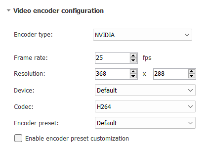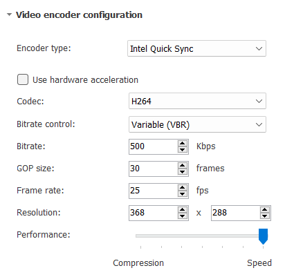 Once you have selected the video encoder, the corresponding configuration options are displayed: