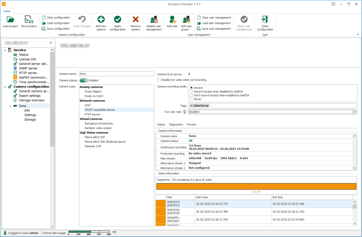 For each camera, there is an Info branch, where you can enable/disable the camera, find status information, diagnostics and a camera preview.